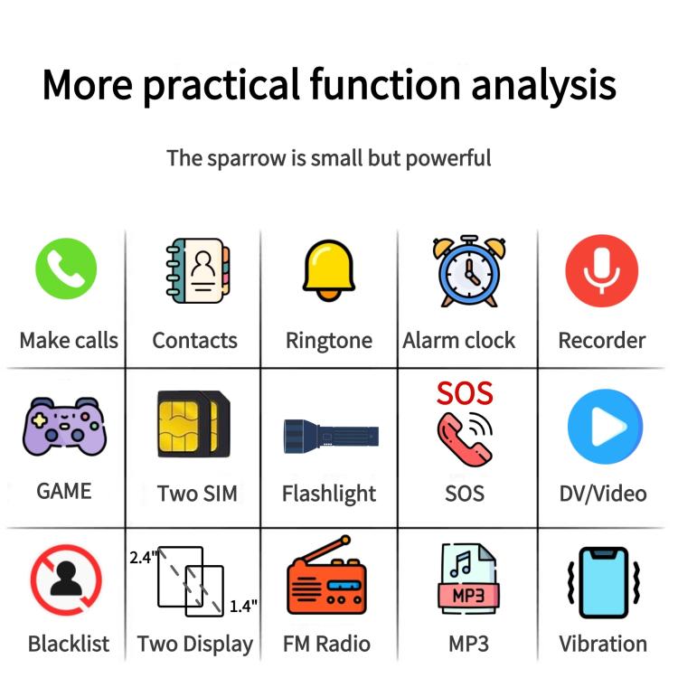 11. Tools: SOS, Family number, calendar, alarm, Calculator, flashlight